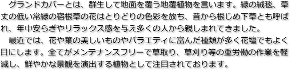 グランドカバープランツは、草刈りの重労働と危険な作業を軽減し、鮮やかな風景を演出します。当社では各種植物の苗、ノウハウを備えておりますので、お気軽にご相談願います。